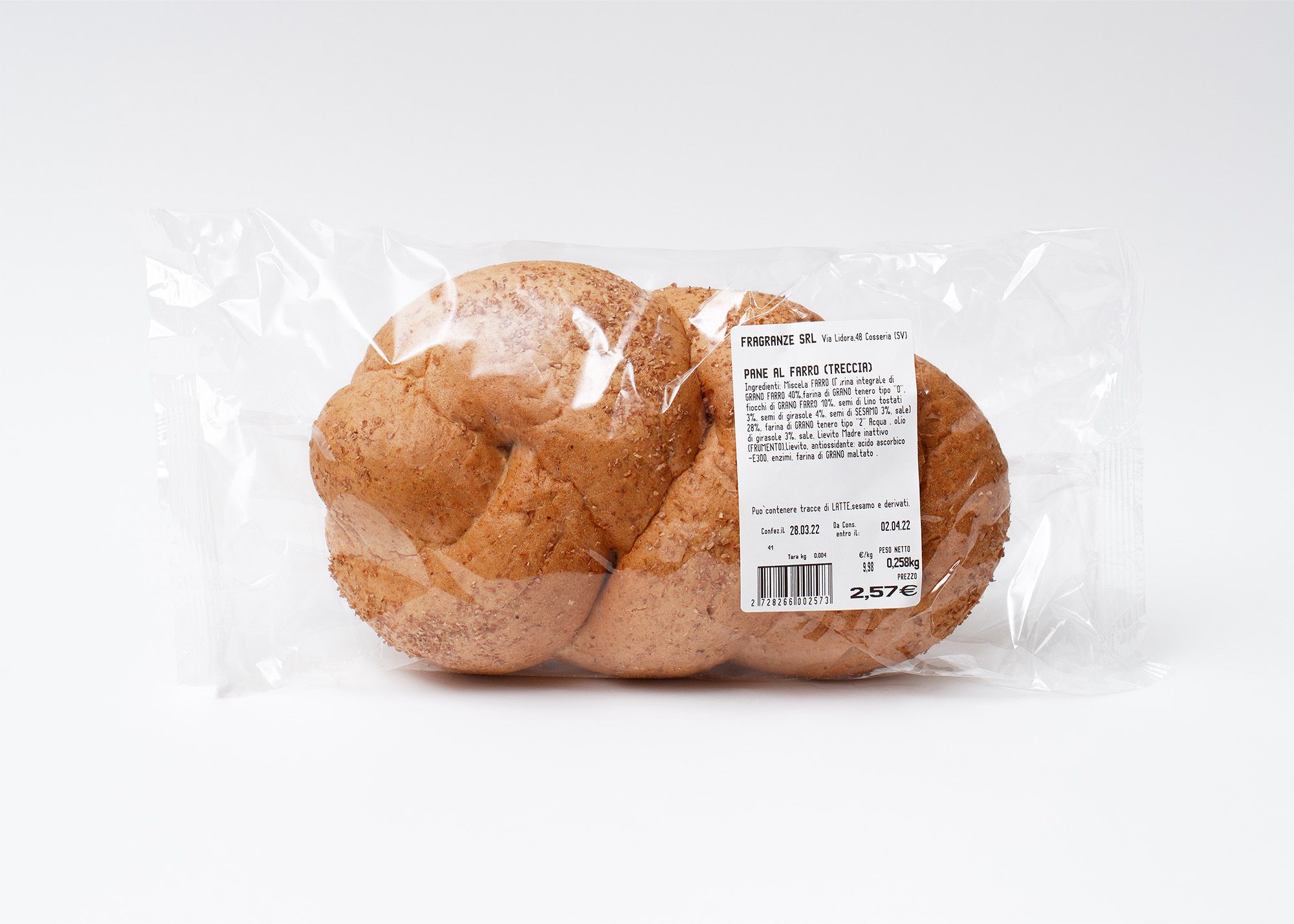 Miscela FARRO (Farina integrale di GRANO FARRO 40%, Farina di GRANO tenero tipo “0”, Fiocchi di GRANO FARRO 10%, Semi di lino tostati 3%, Semi di Girasole 4%, Semi di SESAMO 3%, Sale 28%)