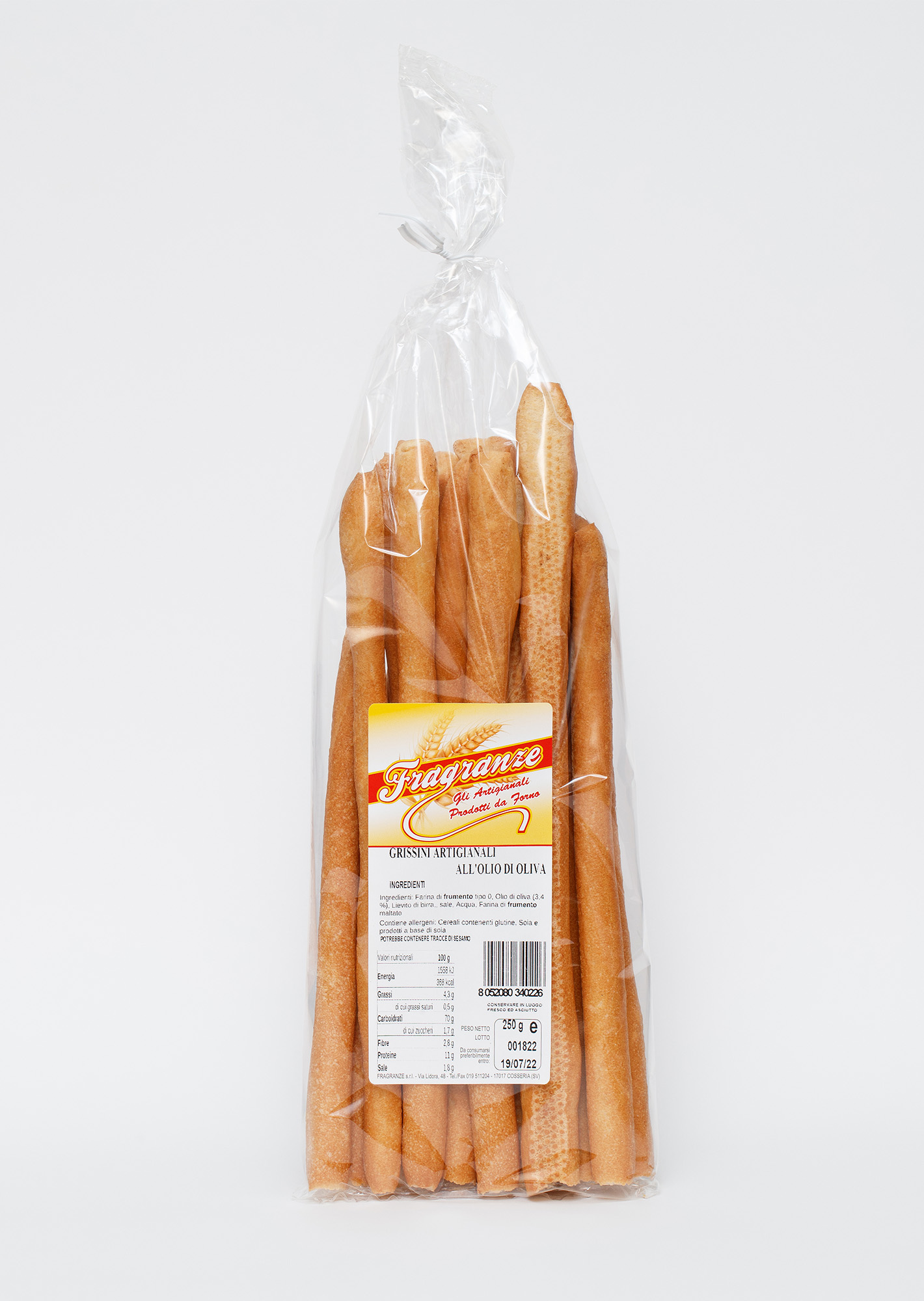 Farina di frumento tipo 0, Olio di oliva (3,4 %), Lievito di birra,, sale, Acqua, Farina di frumento maltato Contiene allergeni: Cereali contenenti glutine, Soia e prodotti a base di soia